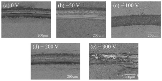 The worn morphology of the coating under different bias voltages is illustrated in Figure 11. Irregular debris layers are observed across the worn surface, indicating abrasive wear as the predominant wear mechanism. During the initial wear process, hard particles and fragments stripped from the coating and friction pair act as the third body, causing micro furrow wear on the friction interface. A similar wear mechanism was also discussed by Wang et al. [30]. Upon careful examination, it is evident that when the pulse bias voltage is −100 V, the coating exhibits the narrowest wear scar width and the smoothest wear scar surface with the least debris around it. This indicates that the coating experiences minimal wear. Notably, the friction coefficient and wear rate change curves of these samples are consistent with these findings. Conversely, at bias voltages of 0 V and 300 V, the coatings show wider wear scars with more debris and rougher surfaces, indicating a higher wear rate. During the friction process, the contact surface of the friction pair is partially adhered due to atomic bonding, which leads to the formation of wear debris after some of the adhered points fall off during the subsequent sliding, which is distributed on the edge of the wear scar. The difference in hardness and critical load for the coatings deposited at these bias voltages may contribute to the varying wear behavior. For coatings deposited at a bias voltage of 0 V with a lower critical load and hardness values, they are more prone to peel off and produce wear debris. The soft abrasives then adhere to the grinding ball’s surface, exacerbating the coating wear. On the other hand, coatings deposited at a bias voltage of 300 V exhibit higher critical load and hardness, but they experience more severe wear. This could be attributed to the reverse sputtering effect produced by the high ion energy, leading to decreased wear resistance. Moreover, the sliding wear test mainly concentrates on intensely fine asperities, and their penetration depth into the coating surface may not exceed the size of debris particles [32]. Therefore, the wear resistance of the AlCrSiN coatings in this study is observed to be influenced by the pulse bias voltage, where higher pulse bias voltage promotes microstructural evolution in the coatings.