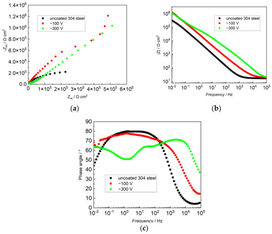 The EIS of uncoated 304 steel and those with AlCrSiN coatings prepared at the bias voltage of −100 V and −300 V with immersion time in 3.5 wt.% NaCl solutions. (a) Nyquist plots; (b) Bode-modulus plots; (c) Bode-phase angle plots.