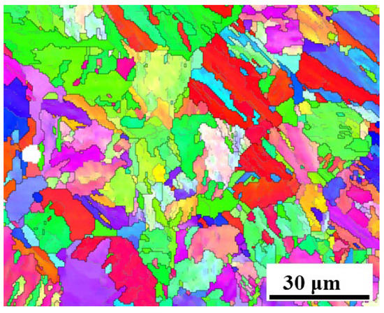 A Cr-Mn-Si-alloyed high-strength steel prepared by hot forging and annealing treatment was selected in this study. The initial microstructure is shown in Figure 1, and the grains were all non-directional equiaxed crystals with an average grain size of 16.6 μm. The chemical composition of the Cr-Mn-Si-alloyed high-strength steel is listed in Table 1. The total amount of alloying elements was not higher than 5%, and the added alloying elements were mainly used to improve the hardenability of the steel, increase the tempering, and improve the mechanical properties.