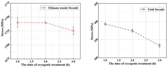 Variation in yield strength and tensile strength at different deep cryogenic time.