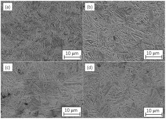 Due to the influence of alloying elements, the start temperature of the martensite transformation is about 314 °C and the end temperature is below room temperature. According to Meng’s research [24], when the alloy steel is held in the austenite temperature zone, the carbon element starts to dissolve when the heating temperature in the austenite zone exceeds the A3 line. The austenite transforms into martensite due to rapid cooling of quenching, and then part of the martensite reverses to austenite after the tempering process, which enhances the toughness of the material. As shown in Figure 5a, the martensite microstructure in the tempered samples shows a morphology of a dense parallel slat pattern after rapid quenching, with the pristine austenite grain boundary (PAGB) acting as the boundary, and martensite slats being distributed along all directions. Residual austenite could also be found after different times of deep cryogenic treatment, as shown in Figure 5b–d. Owing to incomplete martensitic phase transformation, the residual austenite was scattered in the martensitic matrix. Moreover, in addition to slate-like martensite and residual austenite, lamellar martensite grains could also be observed after the deep cryogenic treatment of Cr-Mn-Si-alloyed high-strength steel.