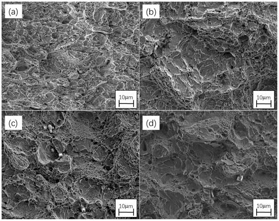 The impact fracture morphologies at four different deep cryogenic times are shown in Figure 6. It can be seen that the fracture form of the quenched–tempered samples were basically microporous aggregated, as shown in Figure 6a. A large amount of micropores could be observed in the SEM images, which contributed to a better impact toughness. However, when the tempered samples were deep-cooled for a certain period of time, the cleavage steps appeared in the internal radiation stripe areas in the impact fracture gradually, and the proportion of the cleavage steps increased with the extension of the deep cryogenic time, as shown in Figure 6b–d. The cleavage steps were relatively few when the deep cryogenic time was 1 h. When the deep cryogenic time increased to 2 h, a large number of small and shallow dimples were distributed on the side of the cleavage steps, and the sample showed a quasi-deconstruction fracture. When the deep cryogenic time increased to 3 h, the impact fracture showed an obvious river pattern, in which each branch of the river pattern consisted of a bunch of parallel-arranged cleavage steps with different heights. A large number of tearing edges and many micropores were scattered inside the branch and no dimples were basically observed, which was characterized by a classical brittle fracture.