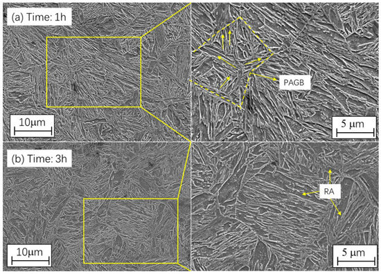 SEM images of Cr-Mn-Si-alloyed high-strength steel during cryogenic process at (a) 1 h, (b) 3 h. (The right image is the area marked by the yellow square in the left image.)