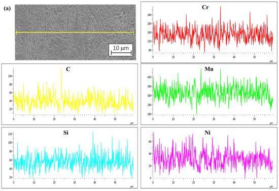 Results of EDS line analysis conducted on the Cr-Mn-Si-alloyed high-strength steel sample in cryogenic treatment for (a) 1 h and (b) 3 h.