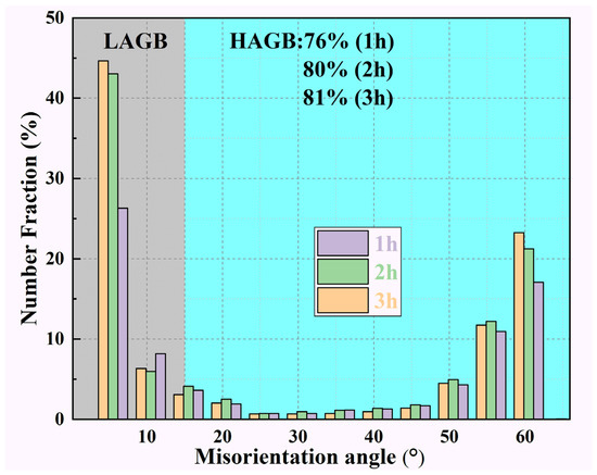 In crystallography, the grain boundaries with an orientation angle lower than 15° are generally referred to as low-angle grain boundaries (LAGBs), and the grain boundaries with an orientation angle greater than 15° are referred to as high-angle grain boundaries (HAGBs). Figure 10 shows the orientation angle distribution of alloy steel at different deep cryogenic treatment times, and it can be seen from the figure that the increased deep cryogenic time makes the proportion of LAGBs decrease while the proportion of HAGBs increases. The reason for this phenomenon is that, under the premise that the deep cryogenic temperature is determined, as the treatment time increased, the transformation of residual austenite into martensite and the shrinkage of the original martensite lattice gradually occurred, forming new grain boundaries, and the newly formed grain boundaries tend to form dislocation plugging, resulting in an increase in the momentum required for free dislocation movement, thus making the tensile strength of the material increase. At the same time, alloying elements have relatively more time to diffuse in the matrix with the transformation of residual austenite into martensite. As shown in Figure 8, the aggregation of alloying elements on the free dislocation pegging for dislocation transformation into LAGBs and then the formation of stable HAGBs played a positive role in promoting the process [25], which can improve the tensile strength of alloyed steel.