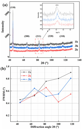 The XRD diffraction patterns of Cr-Mn-Si-alloyed high-strength steel at different deep cryogenic treatment times are shown in Figure 11a. Martensitic diffraction peaks were selected from the diffraction angle range of 40° to 140° with crystallographic lattice coefficients of (110) (200) (211) (220) (310) after different treatment times for Cr-Mn-Si-alloyed high-strength steel, which have the same diffraction peaks at the same diffraction angle, which indicates that the different deep cryogenic treatment times do not affect the lattice constants. The half-width height (FWHM) of each diffraction peak can be obtained automatically by using MDI Jade to analyze the XRD data. However, the FWHM of the same crystallographic index after different treatment times differed greatly, and the peak widths of the diffraction peaks had different degrees of broadening, as shown in the local magnification of Figure 11a.