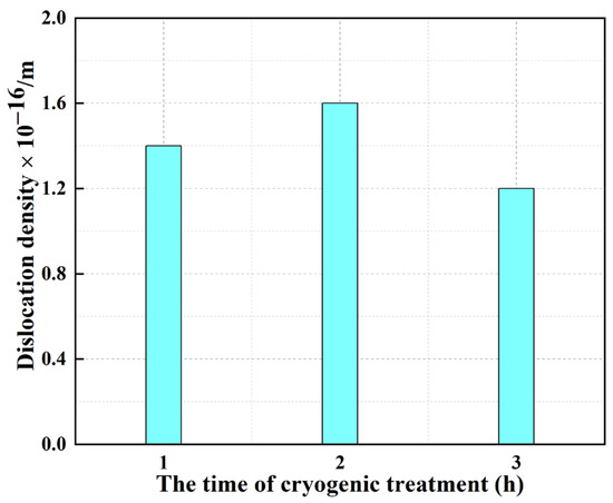 From the analysis of XRD results, it can be seen that the dislocation density of Cr-Mn-Si-alloyed high-strength steel was greatly affected by the deep cryogenic treatment, where the dislocation density of the alloy steel increased significantly compared with that of the Q-T samples, having the highest dislocation density at 2 h of the deep cryogenic process (rising by about 30%), but decreased by 25% when the time extended to 3 h. This proves the argument that the transformation of residual austenite into martensite at a 2 h deep cryogenic time was over. The possible reason for the longer deep cryogenic time taken to reduce the dislocation density in the matrix could be due to the stabilization of the matrix microstructure with the prolonged low-temperature time, and the release of residual stress in the microstructure and the disappearance of part of the dislocation structure. On the one hand, the higher dislocation density played a role in dislocation strengthening; on the other hand, more vacancies and diffusion channels were provided for the diffusion of matrix elements, which theoretically explains the phenomenon shown in Figure 8.