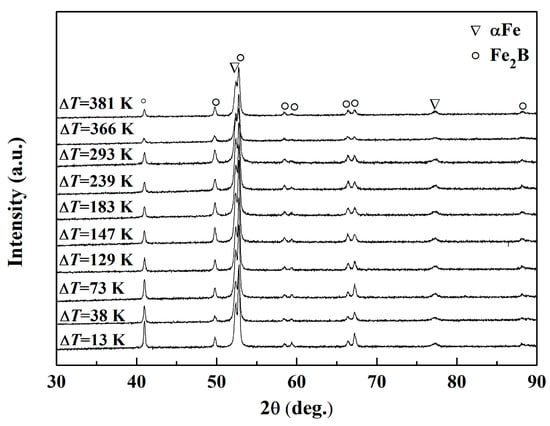 XRD patterns of Fe75B25 alloy solidified at different undercoolings.