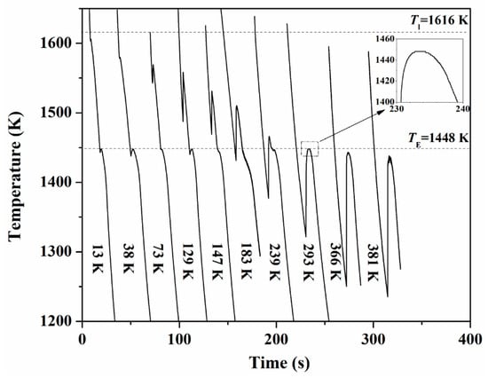 Cooling curves of Fe75B25 alloy at different undercoolings (Tl is the equilibrium liquidus temperature and TE is the eutectic temperature).