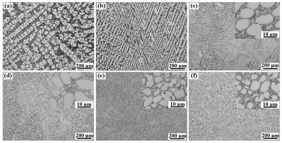 OM images of the sectional microstructure of Fe75B25 alloy at undercooling of (a) 38 K, (b) 73 K, (c) 129 K, (d) 147 K, (e) 366 K, (f) 381 K. Inserts are the local magnifications.