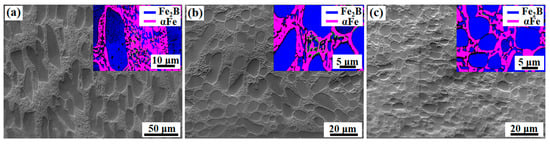 SEM-SE micrographs of Fe75B25 alloy at undercooling of (a) 73 K, (b) 147 K, and (c) 366 K. Inserts are the corresponding EBSD phase color map.