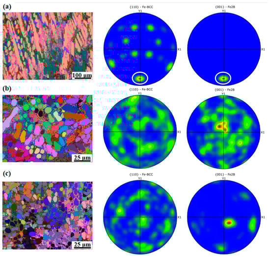 EBSD Euler maps and pole figures indexed to α-Fe and Fe2B phase in Fe75B25 alloy when (a) ΔT = 73 K, (b) ΔT = 147 K, (c) ΔT = 366 K.