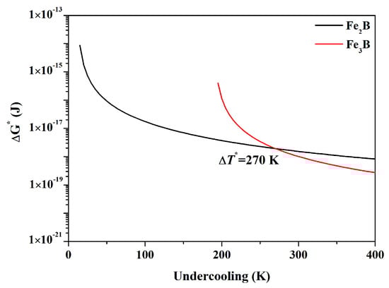Critical homogeneous nucleation work of Fe3B and Fe2B phases at various undercoolings.
