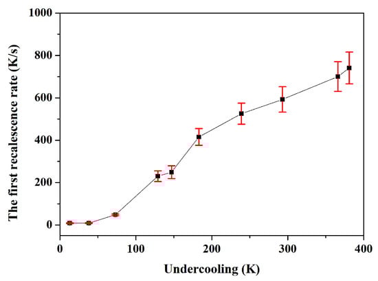 A change in primary phase surely influences the crystal growth velocity. Examining the relationship between growth velocity and undercooling can often provide valuable clues to the phase selection. Crystal growth velocity is proportional to recalescence rate [], i.e., the ratio between the recalescence degree (the difference between the nucleation temperature and maximum recalescence temperature) and recalescence time. Thus, if phase selection took place in the solidification of undercooled Fe75B25 alloy, it would reflect on the curve of recalescence rate versus undercooling. Figure 7 shows the recalescence rate in the first recalescence event. As undercooling increases, the recalescence rate increases almost linearly. There is no breakpoint or inflection point on the curve, meaning that the primary solid remains unchanged, i.e., only the Fe2B primary phase, no other phases, forms in the solidification.