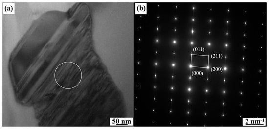 TEM analysis of the sample solidified at undercooling of 147 K: (a) bright-field image, (b) SAD pattern of the marked region in (a).