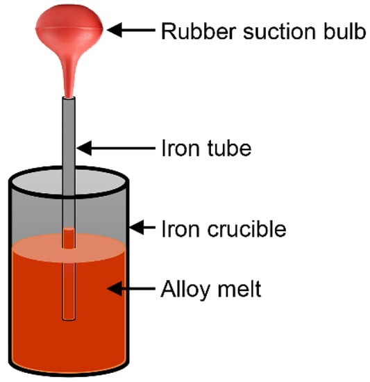 Pure Mg (99.99 wt.%), Pure Al (99.99 wt.%), and intermediate Mg alloys (Mg-30 wt.% Y alloy and Mg-15 wt.% Mn alloy) were used for the synthesis of alloys. Because of the high activity of Mg, the melting and isothermal treatment of Mg alloys were performed in a resistance furnace under a protective atmosphere of 0.5 vol% SF6 and 99.5 vol% CO2. Series alloys with different compositions (Mg-1Al-xMn (x = 0, 0.5, 2, and 3 wt.%), Mg-3Al-xMn (x = 0, 0.5, 2, and 3 wt.%), Mg-1Al-xY (x = 0, 0.5, 1, 2, and 3 wt.%), and Mg-3Al-xY (x = 0, 0.5, 1, 2, and 3 wt.%)) were melted and held in iron crucibles at 963 K, 998 K, and 1033 K. For the Mg-1Al-xMn alloy, the alloy was named Mg-1Al-1Mn (wt.%) when x = 1 wt%, and the names of the other alloys were similar. The crucibles had a depth of 250 mm and an internal diameter of 55 mm, and the thickness of 2 mm ensured a long holding time for the melt at a high temperature. The composition of the crucible employed is shown in Table 1. Then, Mg alloy melts with different alloy contents were held at 963 K, 998 K, and 1033 K, respectively, for 12 h (the temperature error is ±2 K), and the semi in situ sampling method was adopted as shown in Figure 1. As shown in our previous work [], the Fe solution in the Mg melt approached a stable state after a holding period of 12 h. Hence, 12 h was selected for the holding time in this study. During the holding process, a small amount of melt (about 3–10 mL) was taken from the middle part of the alloy melt using an Fe tube (purity 99.9%, with inner diameter 10 mm) and it then quenched in cold water immediately. After sampling, the Fe crucibles with the remaining Mg alloy melts were quenched in cold water for further characterization. For better differentiation, the alloy solidified in the crucible was referred to as the remaining Mg alloy in this work.