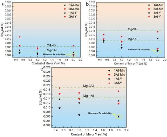 - The solubility of Fe in Mg-Al alloy melts can be reduced by micro-alloying Y or Mn. Additionally, the Fe solubility in the melts is not monotonously dependent on the content of the alloying element. The lowest point of Fe solubility in the Mg-Al-Y ternary alloy melt was at 1 wt.% Y with the same Al content.
