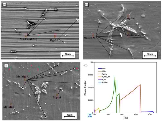 Because of the small size of the precipitation particles, the detailed compositions could not be accurately measured, and so only the detected main components were labelled. The main precipitates were compounds of Mg-Al-Mn-Fe, Mg-Al, Mg-Mn, and Mg-Al-Mn. The quaternary compounds containing Mg, Al, Mn, and Fe were found at the bottom of the Mg-3Al-xMn alloys. Among these quaternary compounds, the detailed compositions showed some differences according to the EDS analysis. It was observed that the formed Fe-containing precipitates were generally larger and settled to the bottom of the crucible, which could reduce Fe solubility in the alloy melt. In addition, there was a large amount precipitation present in the Mg-Al-Mn alloys containing a higher Mn content, which may have contributed to the decreased Fe solution in the alloy melt part. As the content of Fe was below 200 ppm in the studied alloy, the distribution of Fe in the solidified phases could hardly be characterized. Hence, we used the thermodynamic calculation for the predication. The possible intermediate phases were predicted using the latest thermodynamic database of PanMg2023 and an alloy Mg-3Al-2Mn with 200 ppm Fe is taken as an example for the calculation. The Scheil solidification process (no diffusion in the solid phases) of the Mg-3Al-2Mn-0.02Fe alloy was calculated and the presented intermediate phases are shown in Figure 3d (the main phases liquid and α-Mg are not presented in the graph). It should be noted that as the thermodynamic information of the Mg-Al-Mn-Fe quaternary system was quite limited, the accuracy and precision of the current calculation using the available thermodynamic database should also be quite limited and there would also likely be some unreported intermediate phases. The calculation results show the alloys were mainly composed of Al-Mn compounds and the amount of pure Fe was quite limited. Additionally, it was reported there might be some Fe substituted in the Al-Mn phases []. Hence, combining the experimental results and the calculated results, it is proposed that for the Mg-Al-Mn system, Fe was mainly combined with Mn and precipitated.