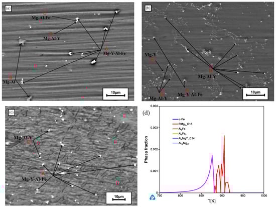 Figure 4 shows the SEM images of the bottom of the remaining Mg-3Al-xY (x = 0.5, 1 and 2 wt.%) alloys. The main precipitates were compounds of Mg-Y-Al-Fe, Mg-Al, Mg-Y, Mg-Al-Fe, and Mg-Al-Y. Similar to the Mg-Mn-Al alloy, the low Y content in the melt was due to the settled precipitates containing Fe and Y, which was consistent with the ICP results. The precipitates in the alloys with higher Y contents showed a bigger size. The Scheil solidification process of the Mg-3Al-2Y-0.02Fe alloy was calculated and the presented intermediate phases are shown in Figure 4d (the main phases of liquid and α-Mg are not presented in the graph). According to the calculation predication, the amount of α-Fe was much less than that in the Mg-3Al-2Mn-0.02Fe alloy and there were some Al-Fe compounds presented. The calculated results show, for the Mg-Al-Y system, the Fe was mainly combined with Al. According to our previous study [], the elements with similar features were more likely to be substituted by each other. Different to the Mg-Al-Mn-Fe system, Fe was likely not able to substitute Y in the Y-containing intermediate phase as Fe and Y were quite different atomically. Hence, combining the experimental results and the calculation analysis, it is proposed that there are probably some quaternary phases in the Mg-Al-Y-Fe system and more extensive study on this system is needed; however, this was out of the scope of this work.