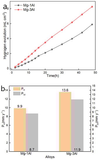 The relationships between the hydrogen evolution volume and immersion time of Mg-1Al and Mg-3Al alloys are shown in Figure 5a. The amount of hydrogen evolution increased with increasing the immersion time in a linear manner. The corrosion rates did not change much with the increase in immersion time. Figure 5b shows that the behaviour of the hydrogen evolution rate PH was the same as that of the weight loss rate PW. The PH and PW values of the Mg-1Al alloy, 9.9 and 8.7 mm∙y−1, respectively, were less than those of the Mg-3Al alloy. Kim et al. [] reported that the corrosion rate of commercially pure magnesium was 230 mm∙y−1 using the hydrogen evolution experiment in 3.5% NaCl solution for 72 h. It can be seen that the hydrogen evolution corrosion rate of Mg could be significantly reduced by adding a small amount of Al. With the increase in Al content, the hydrogen evolution and weight loss rates increased, which may be related to the higher Fe solubility in Mg alloys with higher Al contents.