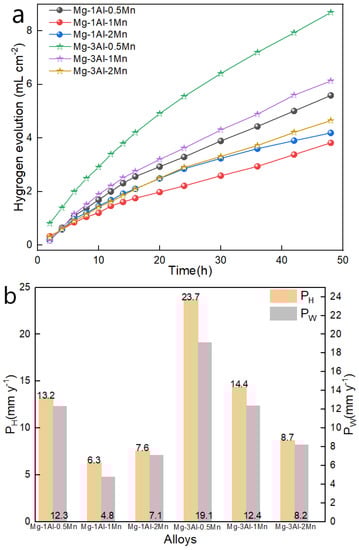 (a) Hydrogen evolution and (b) hydrogen evolution and weight loss rate of the Mg-1,3Al-xMn (wt.%) alloy after soaking in 35 (±1) g/L NaCl solution at 293 K (±2) at room temperature for 48 h.