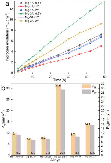 From Figure 7a, it is found that linear relationships for the studied Mg-Al-Y ternary alloys were displayed between the amount of hydrogen evolution and the immersion time. It can be seen that their hydrogen evolution volumes increased with the increase in immersion time. As presented in Figure 7a, as the Y content increased, the corrosion rates of Mg-Al-Y ternary alloys with certain Al contents did not change in a linear way, where the values first decreased and then increased with a minimum point of 1 wt.% Y content. The corrosion rates of all Mg-1Al-xY (x = 0.5, 1 and 2 wt.%) alloys were smaller than those of the Mg-3Al-xY (x = 0.5, 1 and 2 wt.%) alloys.