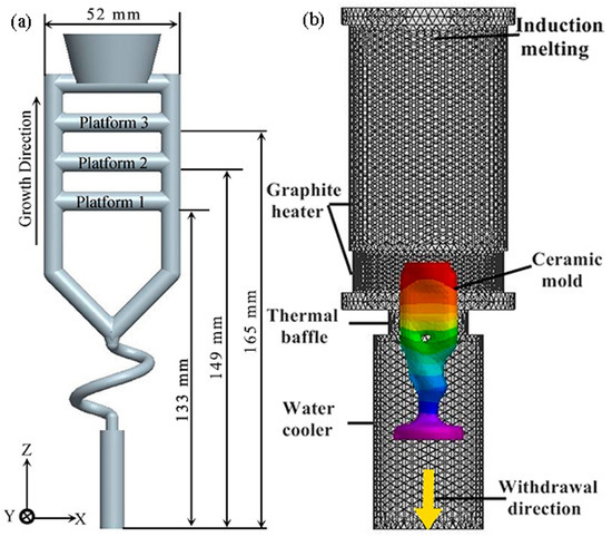Schematic of the sample assembled with a spiral grain selector (a) and the FEM mesh model of the casting system (b).