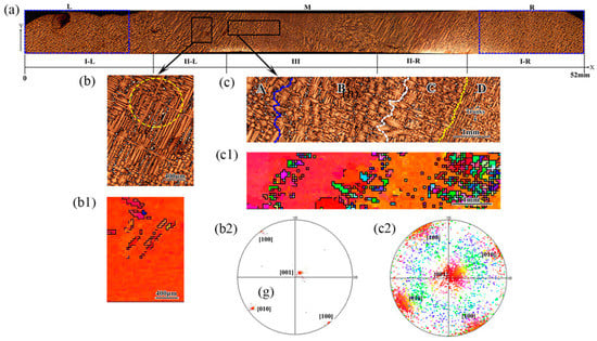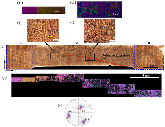 In order to further confirm the dendrites’ evolution, the formation of fragments, and the dendrite deformation in the rejoined platforms, a metallographic test and EBSD measurements were performed on the longitudinal section (parallel to plane XZ) of platform 3, as shown in Figure 3. Similar to the dendritic evolution within the transversal surface, in regions L and R, the primary dendrites were arranged neatly like branches. As dendrites gradually grew into the middle region of the platform, the arrangement of the dendrites deteriorated. At first, there was a small number of detached dendrites, but later, a large number of broken dendrites appeared. In other words, the number of broken branches significantly increased as the dendrites gradually grew into the platform. Beyond that, another phenomenon, dendrite deformation, was found in the longitudinal section of the platform, as shown in Figure 3a. The red dashed line in Figure 3a is the growth path of the deformed dendrites. Figure 3(a1) and Figure 3(a2) are the EBSD scan image and polar diagram at the corresponding position, respectively. From these figures, it can be seen that the orientation of the main trunks gradually changed, corresponding to the color region in the figures from purple to yellow. This further verifies the existence of dendritic deformation. Finally, a grain boundary formed at the convergence interface, as shown by the yellow dashed line in Figure 3b and its EBSD scan (Figure 3(b1)). However, the grain boundary was closer to the left side of the platform. This might have been related to the original orientation of the dendrites on both sides and the competitive growth between them. In addition, all the fragments distributed along the deformed dendrite (Figure 3a) were located at the intersection, as shown in Figure 3c and its EBSD scan in Figure 3(c1).
