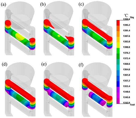 Based on the numerical simulation, the shapes of the isotherm in the mushy zone of the rejoined platform with the advancing of the solidification interface were predicted, as shown in Figure 4. It was found that the shapes of the isotherm varied at different times. Firstly, the temperature on both sides of the platform was lower than liquidus (1342 °C) and the interface slightly tilted towards the platform, as shown in Figure 4a. Further withdrawal of the mold resulted in shifting the liquidus isotherm into the platform, as shown in Figure 4b. Then, the interface became a symmetrical sloping groove, as shown in Figure 4c,d. This meant that the lateral heat extraction was enhanced in the platform and this inference was confirmed by the simulation results of the thermal gradient (Figure 5). Finally, directional solidification was completed on the top side of the platform, as shown in Figure 4e,f.