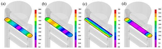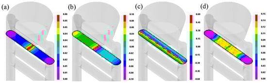 Figure 5 shows the simulation results of the total thermal gradient and the components in three directions of the rejoined platform. As seen from this figure, the total thermal gradient gradually decreased from both sides to the middle region (Figure 5a), the thermal gradients along directions X and Y fluctuated (Figure 5b,c), and the thermal gradient along the Z direction was the lowest in the middle region of the platform (Figure 5d). Thus, it can be seen that the lateral thermal gradients (directions X and Y) were higher but fluctuating. The simulation results of the solidification rate also exhibited similar laws, as shown in Figure 6.