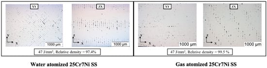 - Li, R.; Shi, Y.; Wang, Z.; Wang, L.; Liu, J.; Jiang, W. Densification behavior of gas and water atomized 316L stainless steel powder during selective laser melting. Appl. Surf. Sci. 2010, 256, 4350–4356. [Google Scholar] [CrossRef]