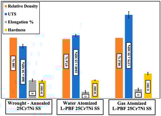 | L-PBF water atomized 25Cr7Ni | 97.6 | 0.3 ± 0.06 | 1.0 ± 0.01 | 1.7 ± 0.1 | 19.6 ± 1 |