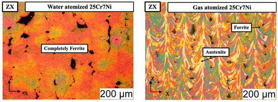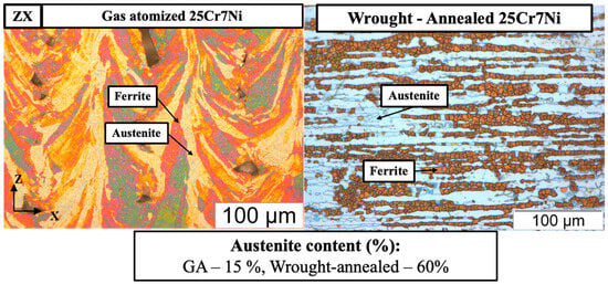 - Davidson, K.P.; Singamneni, S.B. Metallographic evaluation of duplex stainless steel powders processed by selective laser melting. Rapid Prototyp. J. 2017, 23, 1146–1163. [Google Scholar] [CrossRef]