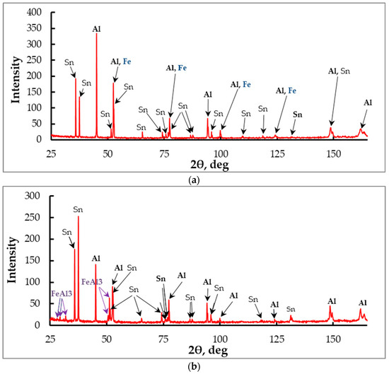 Iron particles that are in contact with the Sn–Al melt form iron aluminide, since the liquid that wets them contains a high concentration of chemically active Al atoms, which are capable of interacting with the iron surface. In principle, many phases with a different structure and composition can be formed in the “Fe–melt” diffusion zone, but the X-ray phase analysis shows the formation of only three phases in all specimens after the completion of alloying: Al, Sn, and intermetallic compound Al3Fe (Figure 2). Our results are in good agreement with the data of [25].