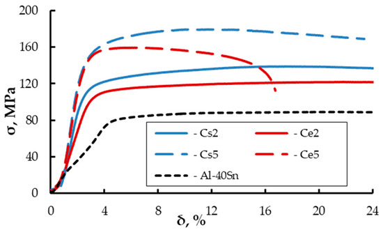 This deformation stage with a slight slope, almost parallel to the δ axis, is characteristic of the compression curves of both Al–40Sn alloy and Ce alloy specimens. The higher the concentration of hard particles in the alloy, the shorter this stage. The shortest stage is found in alloys Ce5, which ends with a rapid decrease in the flow stress of the specimens due to material cracking (Figure 8).