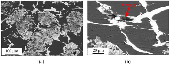 It is known that iron aluminides dissolve in liquid aluminum. Therefore, particles inside aluminum regions coarsen during sintering due to the dissolution of small particles and the precipitation of dissolved atoms on the surface of larger ones. In addition to liquid-phase recrystallization, there is another coarsening process, namely aggregation of iron aluminide particles, which reduces the interfacial energy in sintered materials. The described processes of the coarsening of iron aluminides in the aluminum matrix are clearly visible in the image given in Figure 3d.