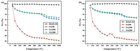 The TG curves of denitration catalyst carrier titanium dioxide, dehydrated under different atmospheres, are shown in Figure 2. As shown in Figure 2a, significant weight loss was observed for the denitration catalyst carrier titanium dioxide (SA90, SA100, and SA200) in the air atmosphere. This observation suggests that dehydration occurred in SA90, SA100, and SA200 as temperature increased. Similarly, as can be seen in Figure 1b, SA90, SA100, and SA200 also exhibited obvious dehydration with increasing temperature under the nitrogen atmosphere. The loss rates of SA90, SA100, and SA200 were 12.33%, 3.55%, and 3.56%, respectively, under the air atmosphere, whereas the loss rates under the nitrogen atmosphere were 12.18%, 3.36%, and 3.60%, respectively, which were similar to the theoretical values. In Figure 2, it can be observed that the TG curves of SA100 and SA200 overlapped significantly. This is attributed to the similar dehydration rates resulting from the similar TiO2 carrier preparation processes of SA100 and SA200, which involved further impregnation of metal salt into SA90. In addition, since the calcination temperature during the preparation of S100 and SA200 was higher than that of SA90, more water was dehydrated during the calcination process, resulting in lower weight loss for the TG curve. The sample (BA01-01) was a titanium dioxide specimen, which was treated by high-temperature calcination. The graph is basically a straight line, and the mass loss rate was within 0.5%.