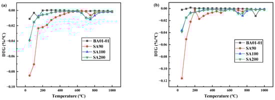 The DTG curves of the dehydration of the denitration catalyst titanium dioxide under different atmospheric conditions are displayed in Figure 3. As shown in Figure 3a, in the dehydration process of SA90 in the air atmosphere, the mass change occurred twice. The first time, the mass change occurred at 60–650 °C, and the thermogravimetric change was very obvious during this process. The second time, the mass change occurred at 650–850 °C, and the thermogravimetric change was weak. The dehydration process of SA100 also underwent two mass changes. The first mass change occurred at 40–600 °C, and the thermogravimetric change was obvious in this process, and the second mass change was from 600–800 °C, also with a very obvious thermogravimetric change. The dehydration process quality of SA200 was similar to that of SA100. The weight loss rate of the standard titanium dioxide sample (BA01-01) did not change significantly. Figure 3b shows that the weight loss change of denitration catalyst titanium dioxide under a nitrogen atmosphere was similar to that of Figure 3a.