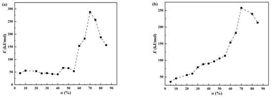 Activation energy (E) of α in the dehydration process of denitration catalyst titanium dioxide under different atmospheres: (a) air and (b) nitrogen.