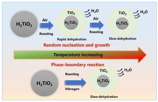 Typically, the denitration catalyst carrier titanium dioxide is prepared using the liquid-phase method [] because this method allows for the preparation of titanium dioxide by the chemical pathway of hydrolysis using titanium compounds (titanium sulphate, titanium oxy-sulphate, or a mixture of the two, as commonly used in industry) []. Subsequent steps such as washing, impregnation, calcination, and dehydration allow for the production of titanium dioxide as a denitration catalyst carrier for different applications [,,]. In the production process of titanium dioxide using the sulfate method, the intermediate product, metatitanic acid (H2TiO3), contains a relatively high amount of water, typically ranging from 40% to 50% and sometimes even up to 60% to 70% [,]. This directly affects the calcination and dehydration process of the titanium dioxide catalyst support, which in turn influences the energy consumption, cost, and other economic indicators of the production. Additionally, the calcination and dehydration processes also have a decisive impact on key quality parameters such as particle size distribution, morphology, and crystalline structure [,]. Wang et al. [] utilized granular activated carbon as a catalyst support and metatitanic acid as the titanium source to prepare supported TiO2 photocatalysts through an impregnation hydrothermal method. The resulting samples were subjected to dehydration and thermal treatment in the range of 300 to 800 °C. It was observed that the sample calcined at 600 °C exhibited the best photocatalytic performance. Rui et al. [] prepared rutile-type TiO2 by microwave calcination using metatitanic acid. The effects of different process parameters on the conversion of rutile TiO2 were studied, among which only calcination temperature and time had significant effects. Chen et al. [] investigated the influence of sulfate ions on the phase transformation and crystal growth of TiO2 during the calcination of metatitanic acid. The results of their study showed that in the desulfurization calcination process, the metatitanic acid samples with added sulfate ions exhibited solid-state crystallization and a transition from anatase to rutile at a temperature 50 °C lower compared to the untreated samples. This indicates that reducing the calcination temperature can effectively mitigate the sintering tendency of TiO2 and facilitate the preparation of uniformly sized TiO2 crystals. Wu et al. [] conducted a study on the calcination temperature and particle growth of TiO2 during the calcination of metatitanic acid. They also observed that the transformation of TiO2 from anatase to rutile generally occurs at temperatures above 600 °C. Lu et al. [] investigated the role of mixed salts (ZnO and P2O5) in the calcination of metatitanic acid to address the problems of high calcination temperature and long calcination time. Komarkova et al. [] investigated the thermal degradation behavior of amine-containing amorphous (peroxo)titanate in air and argon atmospheres. They found that calcination in an air atmosphere leads to the oxidation of organic components in the reactants, which affects the performance of the product.