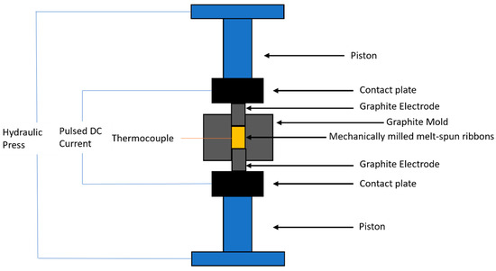 Finally, the compacted powder was sintered into pellets, with a diameter of 10 mm and a height of 10 mm, via SPS. A DR. SINTER LAB Jr. SERIES 632LX machine from Fuji Electronics was utilized for this process, operating under vacuum conditions (<3 Pa) and featuring a maximum sintering DC pulse of 3000 A. A K-type thermocouple was employed to monitor and regulate the temperature. During the sintering process, the ribbons were placed in a high-strength carbon die at a pressure of 90 MPa and at 150 °C. The temperature of 150 °C was established as the optimal operating temperature, beyond which crystallization occurs [11]. A schematic illustration of the SPS technique is shown in Figure 2.