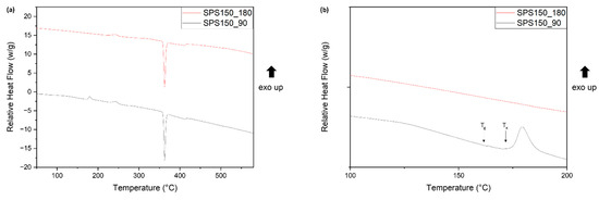 Comparison of DSC traces between SPS150_90 and SPS150_180 (a) across the full range of temperatures (50 °C to 600 °C) and (b) a magnified view of 100 °C to 200 °C.