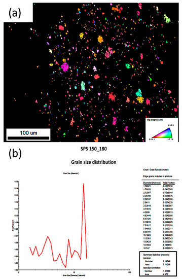 Comparing Figure 6d–f, we can observe that the further increase in sintering time from 60 min to 180 min had minimal impact on porosity (1.88 vol. % in SPS150_60 to 1.22 vol. % in SPS150_180). This may be attributed to a lack of long-range diffusion in atoms that typically require higher temperature [17].