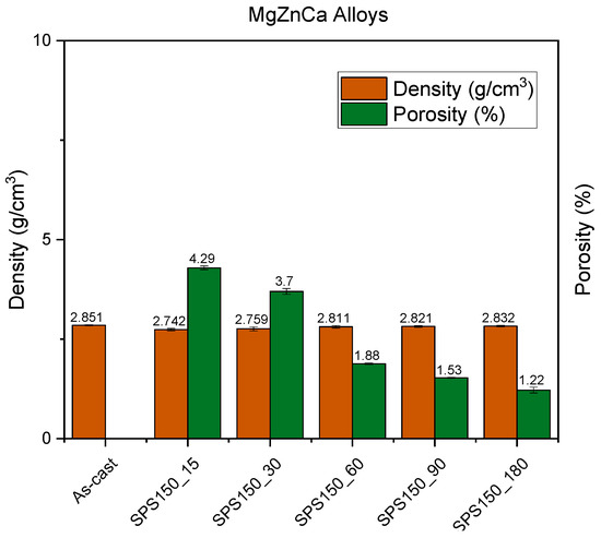 The measured densities and derived porosities of Mg-Zn-Ca spark plasma-sintered BMGs compared to as-cast Mg-Zn-Ca alloy are shown in Figure 7. The densities of SPS150_15, SPS150_30, SPS150_60, SPS150_90, and SPS150_180 are 2.74 g/cm3, 2.76 g/cm3, 2.81 g/cm3, 2.82 g/cm3, and 2.83 g/cm3, respectively, while their respective porosities are 4.29%, 3.70%, 1.88%, 1.53%, and 1.22%. The porosity values are derived by comparing density values to the density of the as-cast Mg-Zn-Ca alloy. Here, increased sintering time has shown to be successful in reducing porosity by ~70% while maintaining the amorphous nature of the BMGs. With an extended sintering time above 60 min, the porosities of spark plasma-sintered samples remained low and represent those of near-net-shaped products (~2%).