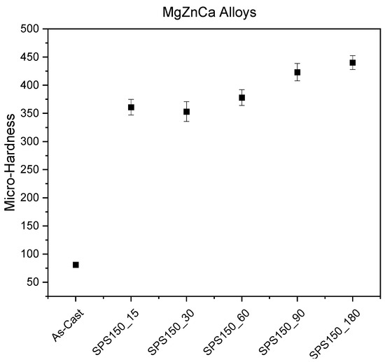 - Increasing the sintering time during the SPS process is effective in improving the density and structural integrity of Mg-Zn-Ca BMGs at 150 °C and 90 MPa.