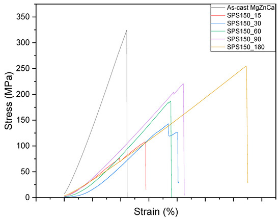 Compressive stress–strain curves of Mg-Zn-Ca BMGs with various sintering times.