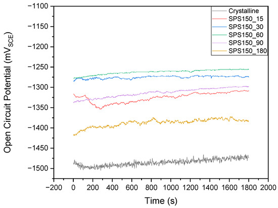 The changes in open circuit potential (OCP) as a function of time after 1 h of immersion in Phosphate Buffer Solution (PBS) at 37 °C are shown in Figure 10. Here, OCP refers to the potential difference between the working electrode (metal surface to be studied) and the reference electrode [24]. The Eocp values for as-cast crystalline MgZnCa and SPS150_15, SPS150_30, SPS150_60, SPS150_90, and SPS150_180 MgZnCa BMGs are −1.47 V, −1.32 V, −1.27 V, −1.25 V, −1.35 V, and −1.4 V, respectively. The less negative the corrosion potential, the lower the tendency for corrosion in PBS [25]. Minor changes in Eocp were noticed from SPS150_15 to SPS150_90, with SPS150_60 having the most positive potential among the sintered samples. SPS150_180 and crystalline as-cast MgZnCa, on the other hand, have significantly more negative potential values, signaling a significant reduction in corrosion resistance as compared to the other sintered samples.