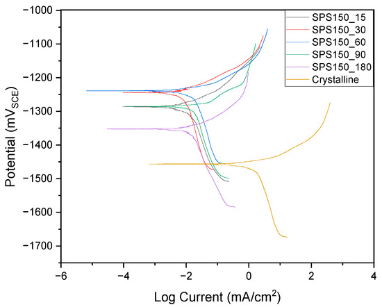 In our earlier discussion, the SEM images of the sintered samples, particularly those with more than 60 min of sintering time, had ribbon interfaces that started fading away, forming a more homogenous matrix. This, coupled with a reduction in porosity, could possibly explain why we see a significant improvement in UCS with prolonged sintering time. The mechanical properties of the sintered samples, particularly SPS150_90, exhibited compressive strength that is similar to cortical bone (220 MPa and 205 MPa, respectively). The similarity in compressive strength can reduce the effect of stress shielding [22], which commonly occurs due to a difference in mechanical properties between the bone and the implant material [23]. Expectedly, SPS150_180 has better mechanical properties among all sintered samples due to its significantly longer sintering time compared to the other samples. However, the presence of crystallization, as shown in Figure 3, will have a detrimental effect on its corrosion resistance, which will be discussed in the next section. Therefore, a careful optimization between mechanical properties and corrosion resistance can be tailored for different applications.