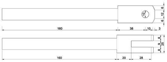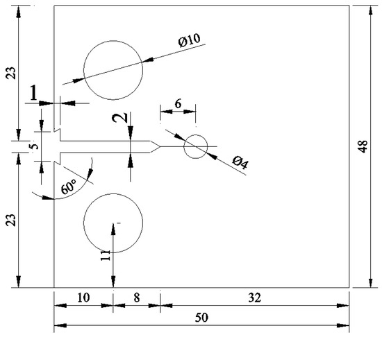 Three C(T) compact tensile samples for each kind of steel were designed for the fatigue test. The prefabricated notch length of the specimen was 8mm, and the toughness zone length w was 40 mm, as shown in Figure 1. A corrosion pit was prefabricated manually, and in accordance with the research of other scholars [31], the corrosion pit was a hemisphere with a radius of 2 mm, positioned 6mm away from the crack tip of the specimen. The experimental fixture had to be customized, and the specific dimensions are shown in Figure 2.