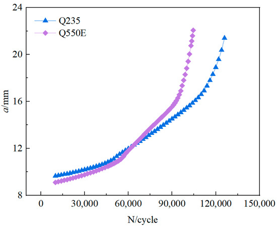 Figure 4 shows the average test results regarding the fatigue crack growth rates of the intact Q550E and Q235. There is no obvious difference in crack growth rate between the two steel specimens in the early stage of crack growth, but the crack growth rate of Q550E is obviously higher than that of Q235 in the late stage of crack growth. The crack growth rate of the two steel specimens in the later stage is much higher than that in the earlier stage.